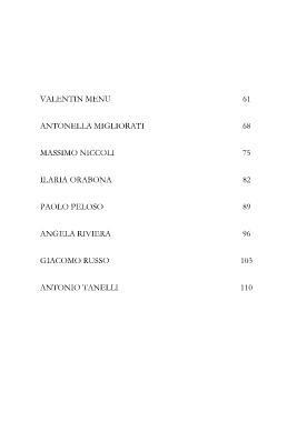 VALENTIN MENU 61 ANTONELLA MIGLIORATI 68 MASSIMO NICCOLI 75 ILARIA ORABONA 82 PAOLO PELOSO 89 ANGELA RIVIERA 96 GIACOMO RUSSO 103 ANTONIO TANELLI 110